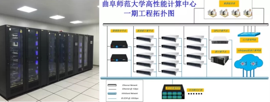 曲阜师范大学高性能计算中心采用CPU+GPU的异构集群架构, 首期工程总计1656个CPU计算核心, CPU计算能力为136TFlops, GPU节点计算能力9.4TFlops。单节点采用gold 6132CPU搭载192GB内存,单节点计算速度高于现在国内大部分超算平台。