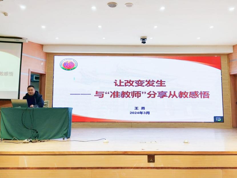王勇做了题为《让改变发生——与准教师分享从教感悟》的报告。在报告中,王勇老师与实习生们分享了自身的成长经历和感悟,鼓励实习生提高学习力,增强竞争力,成为更好的自己。从课堂价值、课堂内容、课堂实施和课堂评价等方面,介绍了成为一名好的物理老师,应该如何在专业上锤炼自我。