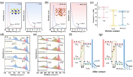 图3 (a) CoS和(b) Ru-Fe2O3的UPS光谱;(c) CoS、Fe2O3和Ru-Fe2O3接触前能带图;Fe2O3/CoS和Ru-Fe2O3/CoS的ISIXPS光谱图:Fe 2p (d)和Co 2p (e);(f) Fe2O3/CoS和(g) Ru-Fe2O3/CoS接触后(虚线)和外加电压(实线)下的能带图。