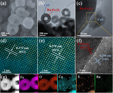 图1:(a) Ru-Fe2O3/CoS的SEM图像;(b-c) Ru-Fe2O3/CoS的TEM和HRTEM图像;(d) Fe2O3和(e) Ru-Fe2O3的HRTEM图像;(f)为(c)中黄色虚线标注的对应区域;(g) Ru-Fe2O3/CoS中Fe、O、Co、S、Ru的对应元素分布图。