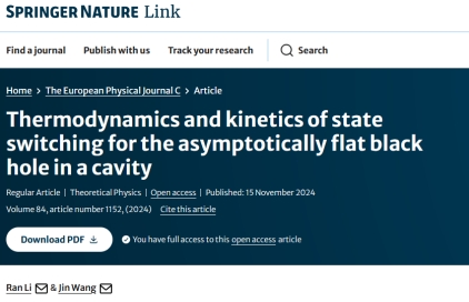 渐近平坦黑洞的相变也是大家所关注的问题。课题组系统研究了黑洞-空腔体系的热力学性质及其状态切换的动理学。通过量化相应的自由能景观,绘制了黑洞-空腔体系的相图,揭示了无电荷黑洞的Hawking-Page型相变行为,以及带电黑洞的Van der Waals型相变行为,并发现黑洞状态切换的动力学行为主要受到系综温度与自由能景观势垒高度的控制。相关研究成果发表在EPJC