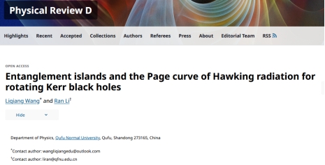 黑洞Hawking辐射引出了一个非常有趣的理论难题:黑洞信息问题,即黑洞蒸发是一个从纯态向混态的非幺正演化过程,不能保证量子信息的守恒。然而,AdS/CFT对应的提出改变了人们的看法。AdS/CFT对应声称AdS时空的引力理论与边界上的共形场论(CFT)对偶,从而AdS黑洞的蒸发可以由边界CFT来描述。这使得人们相信黑洞蒸发是一个幺正过程。近年来,Hawking辐射纠缠熵孤岛规则的提出被认为是此领域最具影响力的进展之一。课题组首次将孤岛规则推广到四维转动Kerr黑洞,发现非极端Kerr黑洞的Hawking辐射的纠缠熵随时间演化呈现出Page曲线行为,并在晚期趋于Bekenstein-Hawking熵。对于极端Kerr黑洞,虽不能确定其Page曲线,但晚期的纠缠熵同样趋近于其Bekenstein-Hawking熵。这些结果表明,孤岛规则有望为旋转黑洞的信息问题提供一个半经典层面的解决方案。相关研究成果发表在PRD,其中本科生王力强同学为论文第一作者,研究内容为其本科毕业论文的主要成果,体现了我院在人才培养与高水平科研融合方面取得的成效。