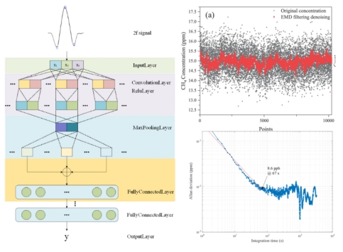 文章研究了可变光程TDLAS检测系统,并把卷积神经网络用于激光光谱大气温室气体传感器的噪声去除和浓度反演,有效降低了传感器的成本、提高了测量精度,使探测器的探测限达到了8.6 ppb(part per billion,10-9)。该研究成果为在极端天气条件下持续监测大气中的温室气体提供了重要工具。