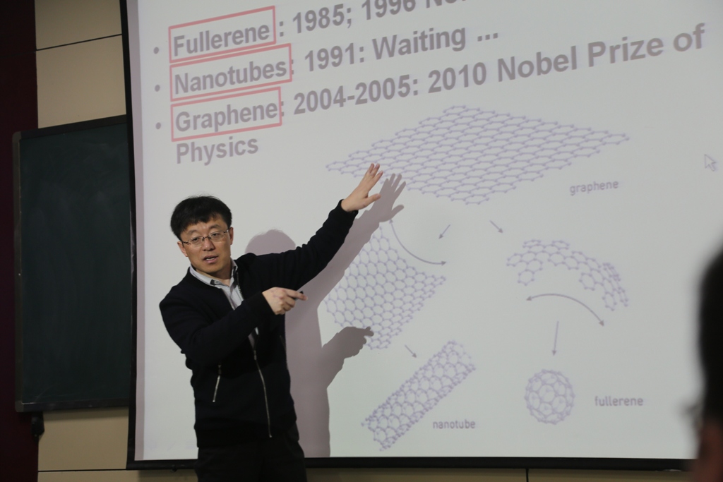 丁峰教授从富勒烯、碳纳米管、石墨烯、纳米金刚石、C60、CNT等的发现、发展和相互转换等方面介绍了碳纳米材料的成员。从2D材料的定义出发,介绍了石墨烯和其它二维材料,并着重介绍了二维材料中的CNTs和石墨烯的电学、光学、机械、热导率、化学等性能,以及2D材料的应用和制备合成方法。报告结束后,丁峰教授与我院教师和学生进行了热烈的交流和讨论,并针对教师和学生提出的问题予以耐心解答,大大激发了学生的学习兴趣。