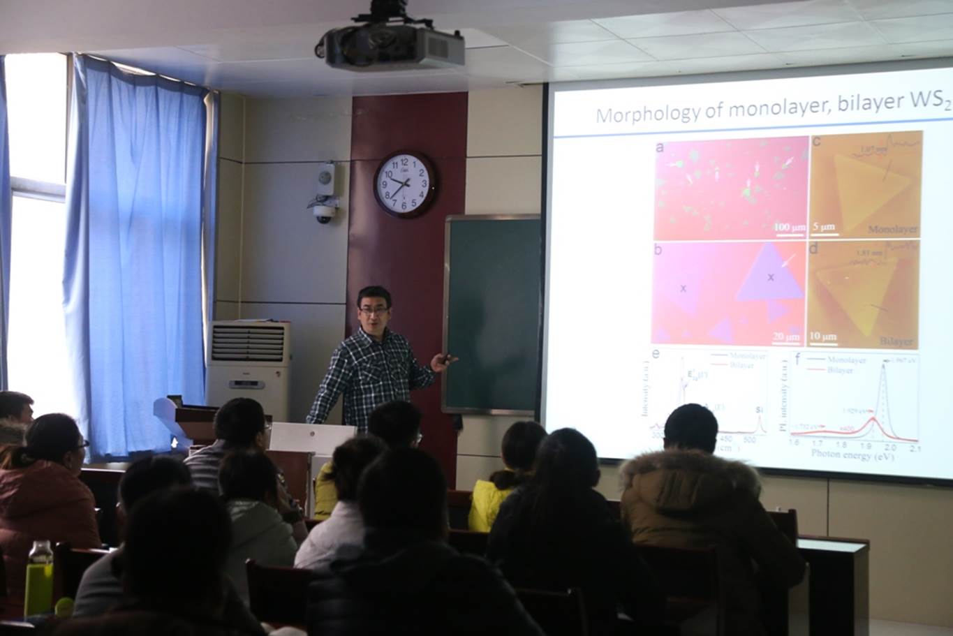 2016年12月12日上午,燕山大学柳忠元教授为我院师生作了题为《CVD-grown triangular WS2monolayer and bilayer crystals----- Optical and electrical properties》的学术报告。