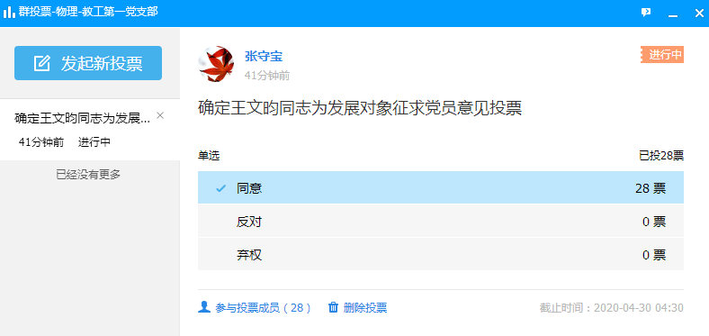 4月29日下午,教工第一党支部全体党员通过腾讯视频会议形式进行“王文昀同志确认为发展对象征求党员意见”。 会议由支部书记张英杰主持。