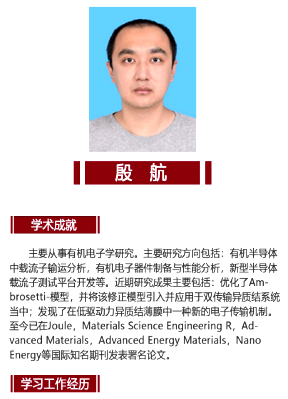 根据电子受体结构的差异,我们研究了三种不同类型异质结,分别为含有富勒烯受体、非富勒烯小分子和聚合物受体的给:受体系统。在这些系统中,受体的纳米拓扑结构分别与球形、扁平形与条形近似相关。我们发现,电子渗透完成状态时的受体体量分数由高到低依次为富勒烯、非富勒烯小分子和聚合物。我们引入有效体量这一新的参量,用来量化异质结中对电子输运有所贡献的受体比例。结果表明,全聚合物系统中的有效体量最高,因此其能够更好地保持异质结中当体量变化时的电子输运能力,并且基本免疫于惰性杂质和空气中水分子,这与基于富勒烯的异质结系统形成了鲜明的对比。我们的研究结果将异质结中的电子输运行为与受体的纳米拓扑结构联系起来,为理解异质结中的纳米形态提供了指导与借鉴。