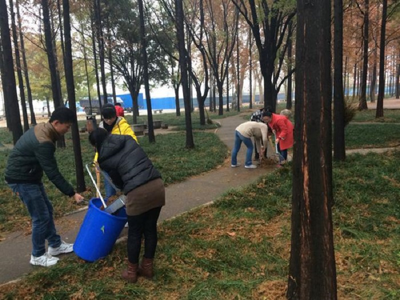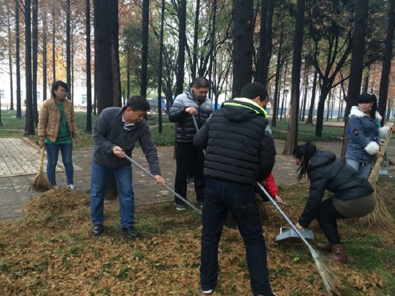 11月28日上午,我院2014级辅导员孙金杰亲自带领2014级物理学一班、二班、三班的部分同学,在我院卫生区清理落叶。