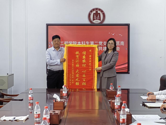 卢绪海向学院赠送锦旗,感谢学校、学院以及第一书记张旭老师对坡木村和村党支部各项工作的支持和帮助,党委副书记王琼代表学院接受锦旗。随后,参会人员进行合影留念。