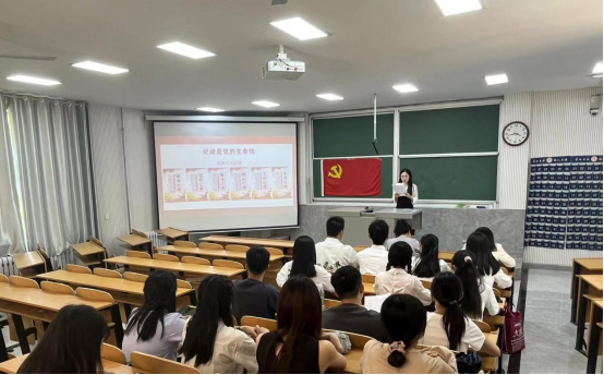 本科生第三党支部书记朱佳文以“强化纪律规矩意识,启发崇廉守纪自觉”为题,探讨党纪的重要意义,结合党的历史征程,强调全体党员应以实际行动践行党的宗旨,抵御外界诱惑,相互监督,共同进步。