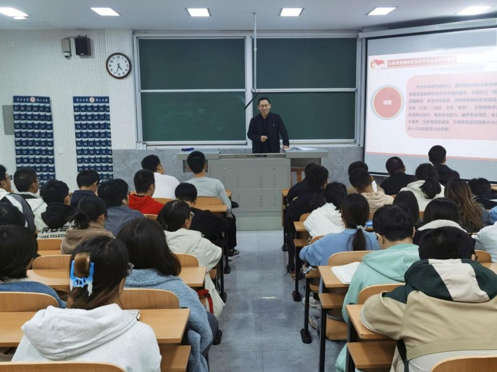 于健紧紧围绕习近平总书记关于“教育家精神”和关于建设教育强国的重要论述,从“以教育家精神增添教师专业发展的‘底色’、‘本色’和‘亮色’”三个角度出发,结合时代发展现状,全面阐述教育家精神的丰富内涵和实践要求,号召学生要以教育家精神为榜样,树立终身从教理想信念,传承强师报国初心使命。