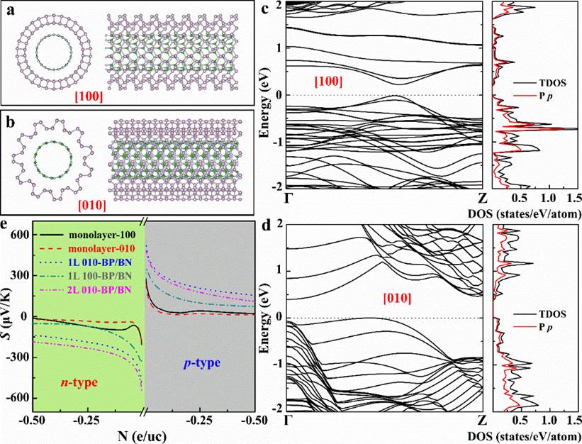 图3 一维黑磷-氮化硼异质结的理论计算模拟: (a、b) 纳米管结构;(c、d) 电子能带结构和态密度;(e) 室温热电势