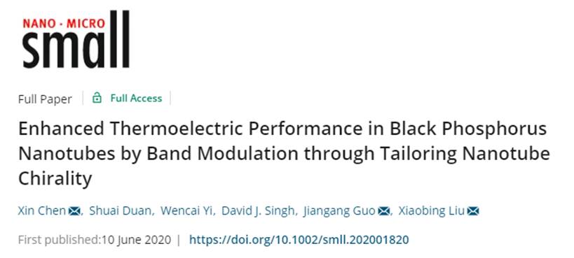 为了充分利用黑磷层内热电转化效率各向异性这一独特优势,该团队探索载流子传导的不同取向以得到最佳的热电输运性质,构建了沿不同晶轴 (1,0)、(0,1)、(1,1)、(1,2)、(2,1) 取向的黑磷纳米管。通过计算发现,黑磷纳米管的电子结构与晶轴取向之间存在强烈的依赖关系,沿 (1,1) 晶轴取向纳米管的表面电子态沿轴向分布,电子结构具有多能谷的能带特征,有利于电输运性能的提升。进一步计算分析发现,纳米管结构的载流子迁移率在室温下可达 2430 cm2V-1s-1,约为黑磷烯的2.5倍,室温热电优值相比黑磷约提高了一个数量级。相关论文以题为“Enhanced thermoelectric performance in black phosphorus nanotubes by band modulation through tailoring nanotube chirality”发表在国际材料科学顶刊Small上(SCI一区TOP期刊,影响因子11.459),陈欣教授为文章第一作者,2018级硕士研究生段帅为文章第二作者,刘晓兵教授与陈欣教授为文章通讯作者。