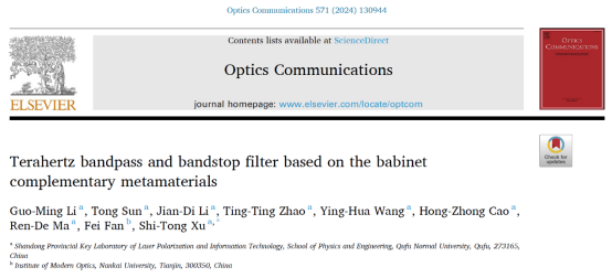 太赫兹滤波器在实现特定太赫兹频率选择中起着不可替代的作用,然而传统的天然材料难以实现特定的太赫兹选择滤波。基于此,课题组利用经典的光学巴比涅(Babinet)原理,设计提出了一种双层互补超材料太赫兹滤波器,该滤波器由中间硅衬底两侧的椭圆孔结构和椭圆环结构组成。不同于传统滤波器只能实现单一太赫兹带通或带阻滤波功能,本研究基于Babinet互补结构在前后超表面的共同作用下同时实现了带通和带阻滤波。此外,通过互补超材料的结构旋转,还可以实现角度可调滤波。该研究提出的Babinet互补超材料滤波器具有结构简单、加工方便等优势,在太赫兹通信、成像和传感系统中具有很好的应用前景。该工作以“Terahertz bandpass and bandstop filter based on the babinet complementary metamaterials”为题发表在《Optics Communications》,课题组研究生李国明为论文第一作者,许士通副教授为通讯作者。