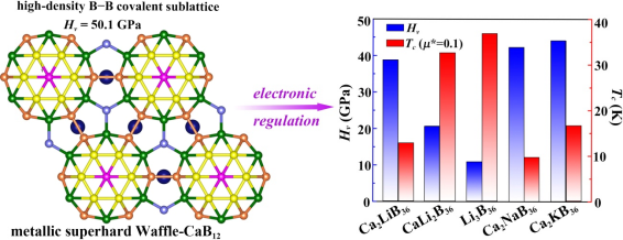 由于金属硼化物的硬度主要来自于B-B共价键,为了进一步提高硬度,该团队在硼含量更高的AMB12中设计了一种具有高共价键密度的超硬材料。利用Calypso高压结构搜索软件预测了一种可以稳定到常压条件的Waffle-CaB12超硬金属材料。有趣的是,该结构表现出了全新的硼原子晶格,形成了一种独特的“Waffle-like”B32团簇。Waffle-CaB12中共价键密度为0.39 Å-3,硬度值高达50.1 GPa,是目前已发现的AMB体系中硬度最高的材料,同构的MgB12(Hv = 42.6 GPa),SrB12(Hv = 45.4 GPa)也表现出了超硬特性。结果显示Waffle-CaB12导电性主要来源于硼的σ和 π键沿c轴方向和ab平面所形成的导电通道。该工作给出了waffle-like CaB12的多条合成路径,为其未来在中低压力的条件下实验合成、大尺寸生产和应用提供了必要的前提条件。通过电子调控,得到了一系列超导超硬化合物,如Ca2KB36 (Tc = 16.9 K; Hv = 44.1 GPa)。相关成果以“具有华夫结构的超硬金属CaB12”为题发表在材料科学顶级期刊Acta Materialia杂志上。该工作为寻找具有超硬超导新结构提供了一个新的研究方向。