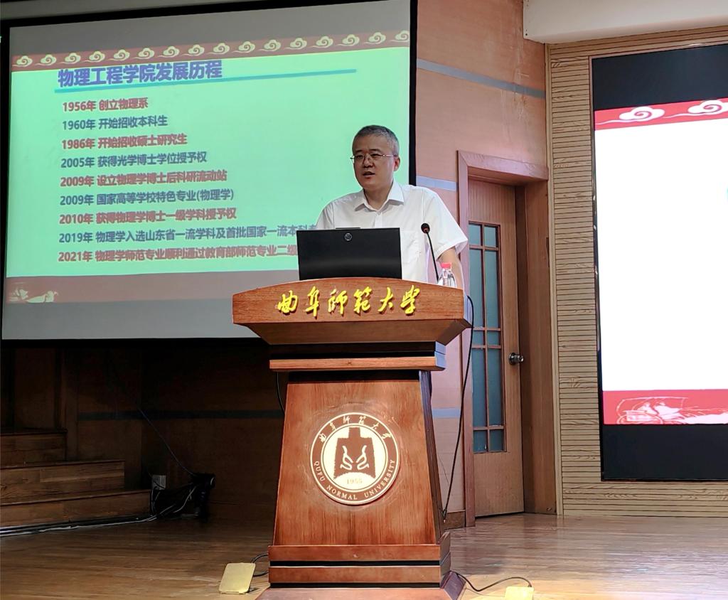 满忠晓从院校历史、师资队伍、专业特色、学科建设、科研成果等方面介绍学院概况,寄语同学们要与时代同振,不断提高自身的学习能力、实践能力、创新创业能力,还要培养良好的自律能力和规划能力,用实干书写曲园学子的时代华章。